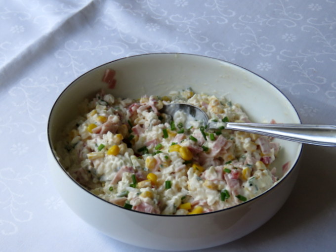 Wieczorem poprzedniego dnia ugotowałam w łupinach ziemniaki i bób... Jeszcze ciepłe obrałam... W piątek, w czasie gotowania obiadu,  usmażyłam na maśle kurki.. Do salaterki włożyłam porwaną zieloną sałatę, ziemniaki pokrojone w plasterki, cebulę, paprykę, ogórek, obrany bób, wystudzone kurki, pokrojone na kawałki pomidory, posiekaną bazylię, szczypior... Sałatę polałam sosem winegret, wymieszałam i posypałam prażonym słonecznikiem... Sałatę podałam z fasolką szparagową i smażonym dorszem...